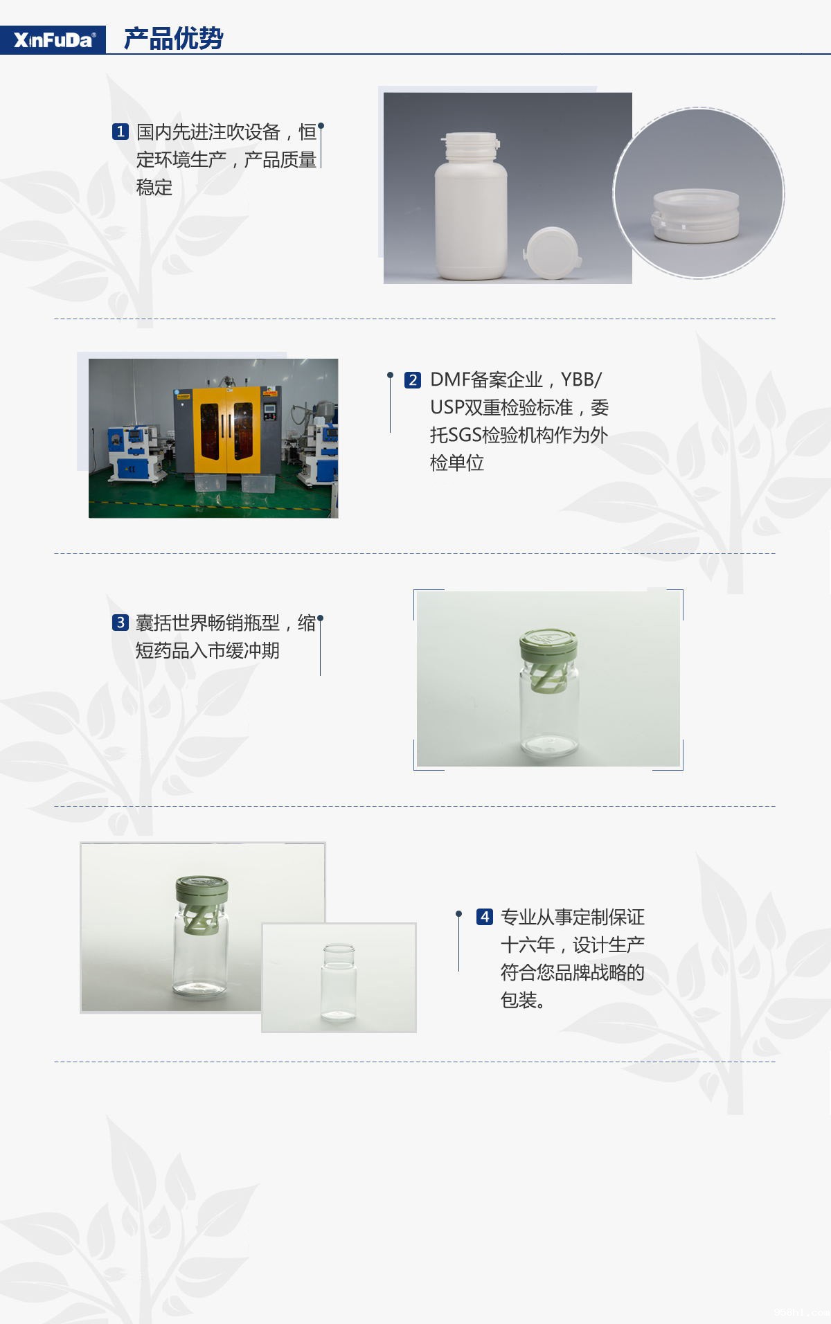 1、注吹设备,恒定环境生产,产品质量稳定; 2、DMF备案企业,YBB/USP双重检验标准,委托SGS检验机构作为外检单位 3、囊括世界畅销瓶型,缩短药品入市缓冲期; 4、专业从事定制保证十六年,设计生产符合您品牌战略的包装。